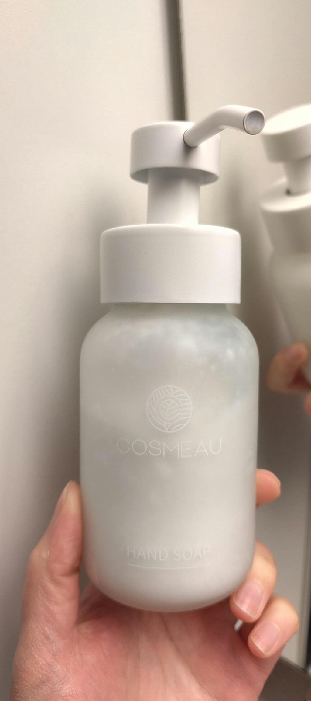 Verwende deine eigene Flasche (250-300ml) oder kaufe die schöne gläserne optionale Cosmeau Handseife Flasche (250ml) mit Edelstahlpumpe.